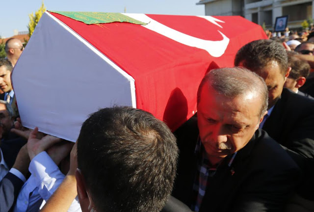 Turkish President Recep Tayyip Erdogan helps to carry a coffin with a victim of a thwarted coup following a funeral service in Istanbul, Turkey.